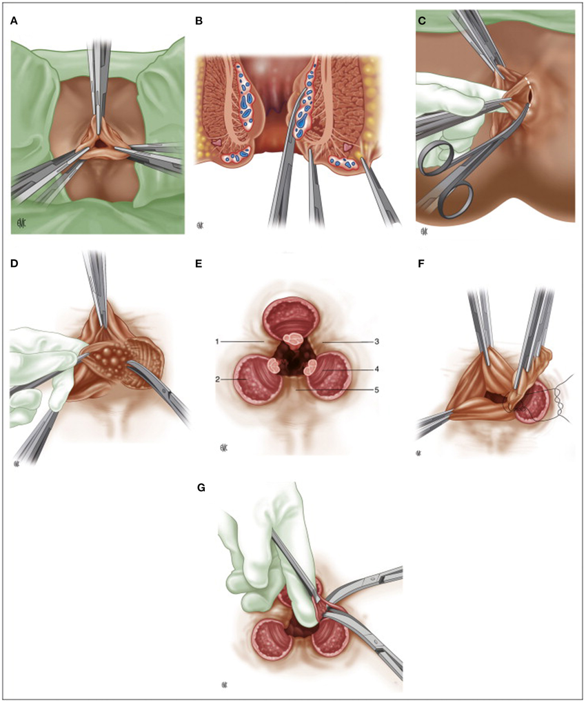 Elle consiste a ligaturer les branches de l’artère hémorroïdale supérieure après avoir excisé les paquets hémorroïdaires correspondants. Les plaies seront laissées ouvertes et cicatrisent en 4 à 6 semaines. Il s’agit de la technique chirurgicale radicale mais également la plus douloureuse.